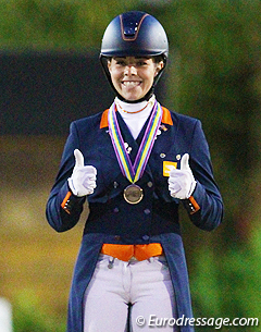 Dutch Jasmien de Koeyer and the 8-year old KWPN mare Esperanza (by Desperados x Krack C) finished in third place and on the bronze step of the podium. The pair was fourth to go early in the morning, but looked fit and fresh. In contrast with the rushed, over tempo team championship test, De Koeyer now really had her young mare together and rode with much more peace and tranquility through the exercises. The scopy moving mare was less rushed in the extensions and showed an brilliant extended walk. The first canter pirouette was unbalanced, the second was better. Esperanza is uphill in her tempi changes. Initially a fifth place appeared on the electronic running score board, but after twenty minutes De Koeyer's marks had been corrected to 73.263% which bumped her into the bronze medal position, overtaking not only Semmieke Rothenberger but also Luca Michels. De Koeyer's paper sheet scores, which are the officially correct ones and not the electronic computer scores, calculated to her final mark of 73.263%.