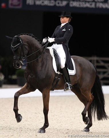 Edward Gal had his foot on the throttle today aboard Gaston Glock's 10-year old Danish warmblood stallion Zonik (by Zack x Romanov). The trot extensions were excellent, the half passes scopey, and the extended walk was very nice. In the canter half passes the black stallion dropped behind the vertical and one left double pirouette was unbalanced. In the two tempi changes the horse swung in the hindquarters, but the ones were straighter. The majority of the piaffes were executed on the track for support. They finished their first World Cup Final in 8th place with 79.654%. Gal's individual marks ranged from 74.500 (Eisenhardt) to 82.850 (Judet)!