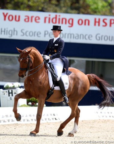 Spanish Severo Jurado Lopez and Marianne Helgstrand's 15-year old Hanoverian gelding Deep Impact (by De Niro x Rubinstein) last competed in December at the 2017 CDI Stockholm and this was their first international outdoor start. The black gelding showed huge trot extensions but lacked bending in the corners, the half passes could have been more smooth in the rhythm. The first piaffe-passage was beautiful and the walk tour was well regulated. In the side silhouette Deep Impact is very expressive with a super engaged hindleg. However the frontal image shows that the horse widens the frontlegs significantly to find balance in passage. Jurado Lopez rode a very focused and accurate test. In the one tempi changes the horse made bigger changes to the right. The left pirouette was lovely but in the right one the gelding lost his balance. They finished second with 75.152%. Their scores ranged from 73.913% to 77.283%.