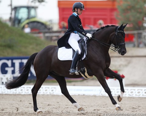 Daphne van Peperstraten and her 11-year old Cupido (by Johnson x Duko) were the top scorers in the team championship test and due to a draw she turned out to be the first starter for The Netherlands in today's test. This early morning ride did not meddle with her concentration as Daphne rode a beautiful, tidy test without mistakes. The bright bay gelding was made a bit hurried in the left shoulder in and overall could have been even more collected so the self carriage increases and the riders can keep her hands more still, but the extended walk was superb with much overtrack and a crisp clear 4-beat rhythm. The collected walk was quite free and open in the frame. The strike off to canter could have been neater and the left canter half pass needed more collection but the uphill extended canter was fantastic. The pair scored 74.471% which puts them in first place so far.