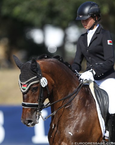 One of the riders that suffered the most from the erratic judging was Russian Anna Guseynova on her 13-year old Westfalian gelding Lauda (by Laudabilis x Florestan). The Dutch based Russian rode a very strong test with a trot that had much pep in the horse's step. The extended walk had a clear rhythm, but the striding could have been more active. The horse was slightly hesitant before the walk pirouette as he anticipated the canter. Also the simple change needed to develop a clearer walk, but the end halt was strong. Overall the test was high standard and the biggest point to argue with Guseynova's ride is that Lauda needs to come in a self carriage more independent from the rider's hand. This was exemplified in the way the horse loses its spring and expression when given the longer rein (uberstreichen). Anna scored a total of 69.912% but McMullen had her at 65.000%, while the other judges ranged between 69.8 and 72.50%.