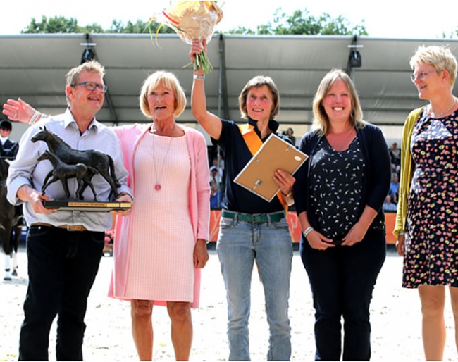 Isabel van Gisbergen-Sponselee was overwhelmed and surprised by the honour that was bestowed upon her. "Emmy de Jeu convinced me to come to Ermelo today, which I normally don't do. When her mares had gone, I was thinking, "right let's go home, back to work", but Emmy insisted that I stayed. Now I know why! I saw Ambria enter the arena and I thought, "hey she looks like Ambria" but after I recognized the rider, I finally got it. Oh my, I really have to catch my breath."