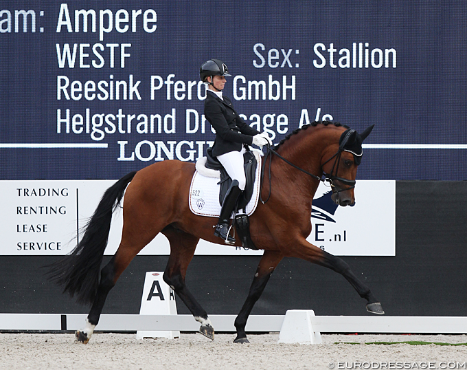 Helgstrand and Cathrine Rasmussen's Westfalian stallion Valverde (by Vitalis x Ampere) has been trained and competed with great success by Eva Möller. The impressive bright bay stallion has had a very busy schedule this year as a breeding stallion. A week ago he won the 2019 Westfalian Young Horse Championships in Munster and Valverde arrived in Ermelo looking tired. In the Finals' test he was at the end of his rope despite his amazing temperament and willingness to work.