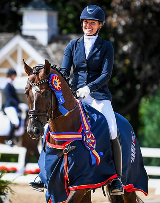 Jackie Ahl-Eckhaus (San Luis Obispo, Calif.) and Kitalis MVS (by Vitalis out of Ember MVS), her KWPN gelding, placed third with an overall score of 8.07. In addition, Ahl-Eckhaus, who bred Kitalis MVS, was presented with the division’s Highest Placed U.S. Bred Horse award.