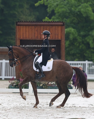 Charlotte Fry and Van Olst's 14-year old Dark Legend (by Zucchero x Tango) already had one outdoor CDI down their belt (CDI Hagen) since the 2022 World Cup Finals. The long legged black dragged his legs in the rein back and the extended walk barely had any overtrack and was tense (scores 5.5 - 6.5), but the tempi changes were as usual dead straight and the trot half passes covered much ground. They posted 73.543% for third place.