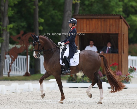 Charlotte Dujardin made her international Grand Prix debut aboard the 9-year old Dutch warmblood by Everdale x Vivaldi owned by Carl Hester and Coral Ingham. The liver chestnut was first shown by Robert Barker in 2017, by Sadie Smith in 2018, before Dujardin took over the ride in the summer of 2020. They were the 2021 British small tour champions and eight weeks ago rode their first national Grand Prix at Myerscough, scoring a winning 77%.
