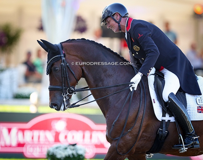 Although the European Championships are on German turf, Great Britain is the favourite for team gold. Britain's second ride of the day came from Gareth Hughes on the 17-year old KWPN mare Classic Briolinca (by Trento B x Royal Dance). The bright bay mare had a career highlight moment at the 2019 European Championships in Rotterdam and then disappeared from the scene between 2020 and 2022 due to an injury. She returned on the team for the 2022 World Championships in Herning, where she ended up excelling in the freestyle and placing fifth. Today, she looked a bit more fragile as if walking on eggshells, even though Hughes rode her very beautifully and quietly. The trot extensions were not crisp clear in the rhythm, nor was the half pass right which also lacked elasticity. The left one was better. The passage, however, was so soft-footed and elegant, but the walk was very limited in overtrack (6.5) and the collected short (6.9). Briolinca gained very good points for the straight tempi changes. The final halt was not polished as the rider already greeted before the mare stood still, she was not immobile. They scored 74.565% for a provisional fourth place. The judges were clearly divided with 71.848% as low score and 77.391% as high score.
