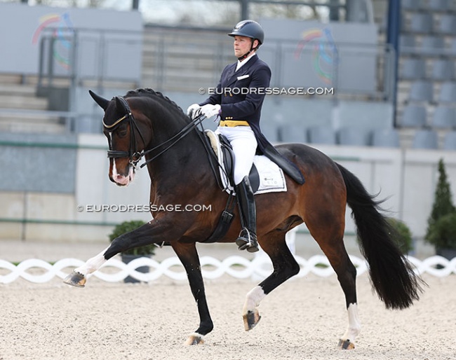 Belgian Flore de Winne and her 10-year old Hanoverian stallion Flynn (by Fahrenheit x Sir Oldenburg) have been going full throttle this winter, competing at the CDI Kronenberg indoor before tackling the World Cup qualifiers in London, Mechelen, Amsterdam, and 's Hertogenbosch. Aachen is their sixth show in almost four months time, two weeks before their World Cup Finals debut in Riyadh. The black stallion is one of Belgium's best Grand Prix horses of the moment and aside from the piaffe, in which he crosses behind, he shows so much class in all the movements. De Winne is only in her third season riding at Grand Prix level but on Flynn she shows great routine and ease. The horse is consistent in the frame, wows in the passage and tempi changes and produced all-out solid riders that deserve every point. Today she scored 71.392%.
