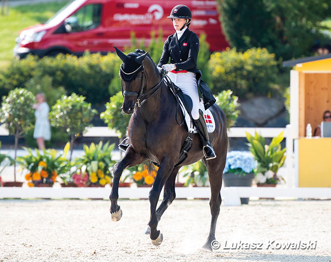 Sophia Ludvigsen on Blue Hors QuintanaGermany won team gold with 218.030 points and had Denmark following in silver place far behind them (211.353 points). The leading Danish ride came from brand new Danish U25 champion Sophie Ludvigsen on the 10-year old Hanoverian mare Blue Hors Quintana (by Quantensprung x Desperados). The pair had some clear contact issues with a gaping mouth in the trot tour, but she upped her points in canter and got a personal best of 71.941% although her scores ranged from 69.853 to 73.235%. Sara Aagaard Hyrm and the 10-year old Danish bred Atterupgaard Cooper (by Charmeur x Gribaldi) picked up 70.265%, while another long-time team rider, Karoline Rohmann and the 15-year old Danish Jakas Don Louvre (by Don Romantic x Lauries Crusador xx) added 69.147% to Denmark's team result. Former medal winner Thea Bech scored below par and was the scratch ride with 66.559%