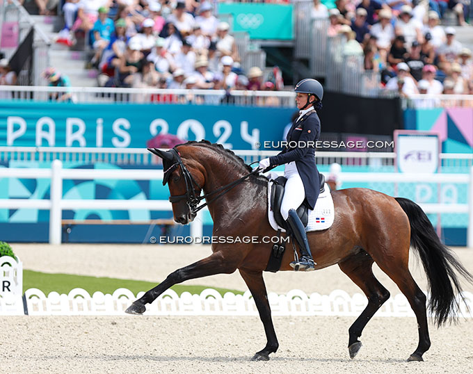 Yvonne Losos de Muniz on AquamarijnThe oldest horse on the show ground, 19-year old KWPN mare Aquamarijn (by United x Gribaldi), also signalled that after 8 years of international Grand Prix level competition with starts at the 2019 and 2022 World Cup Finals, 2019 and 2023 Pan American Games, 2021 Tokyo Olympics, and 2022 World Championships, the Paris Olympics were the final straw. Dominican republic's Yvonne Losos de Muniz produced some very successful and high scoring rides with this horse but in Paris she literally had her hands full with Aquamarijn, who felt totally out of sorts in the arena. She threw the tongue out while travelling the arena and was tense throughout the test. Aquamarijn, just like Blue Hors Zatchmo, were the two horses that did not fair well on this Olympic stage and it makes one wonder if retiring or excusing them from the test would have been the more considerate choice, in all fairness. In the current climate in which animal welfare is such a hot topic presenting such stressed horses in the arena does not bode well.