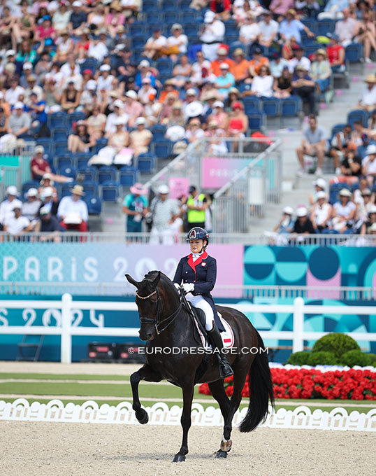 Therese Nilshagen on Dante WeltinoSwedish Therese Nilshagen is one of the few riders who has taken the same horse to three Olympics. The 17-year old Oldenburg stallion Dante Weltino (by Danone x Welt Hit II) travelled to Rio in 2016 but was substituted by reserve Mads Hendeliowitz when Dante turned lame there. The pair has its actual Olympic debut in Tokyo and are now at their third, but officially second, Olympics in Paris. The handsome black stallion is light in the contact and gives an overall friendly and happy impression, but his self-carriage was not so much on point as he bopped the head a little too much and the passage could have been more on the hindlegs. The extended canter remains a strong point as well as the pirouettes. They got 73.991%, a score that put them in the individual finals.
