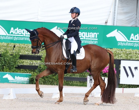 The 25-year old Benjamin Ebeling took over the ride on Ann Romney's 15-year old Hanoverian mare Bellena (by Belissimo M x Welser), which was previously shown by his father Jan. The chestnut mare had a 10-month break from international showing and now returned with Ben in the saddle. The pair needs more time to gel as quite a bit of errors crept into the test (zig zag, ones, loss of rhythm in the trot extensions) but the trot half passes were lovely and the first piaffe showed promise. They scored 66.587%