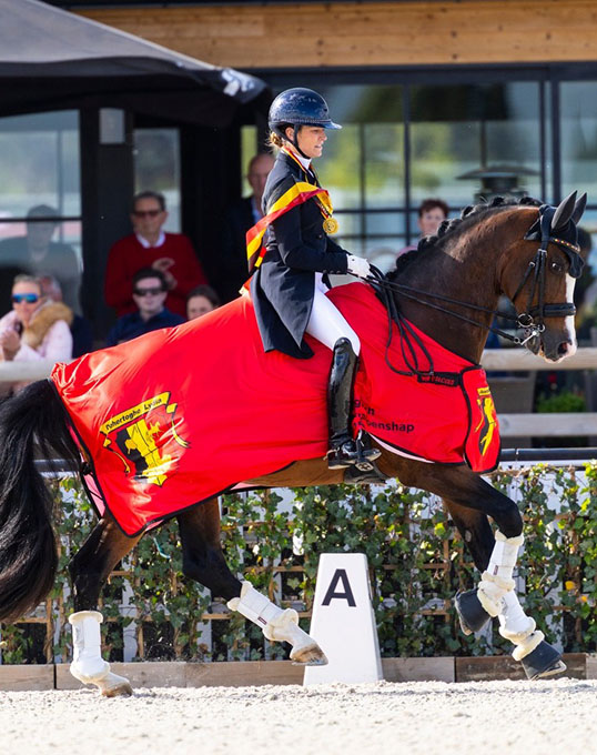 Last year's junior champion Xyliana De Rover got bronze this year. Aboard her 12-year old SBS registered Hamlet (by Quadroneur x Monteverdi) De Rover has not yet competed internationally since the 2024 European in Opglabbeek last July. In Lier at the 2025 National Championships she produced tests earning 68.546%, 70.294% and 72.100% for a third place overall. She trains with Jeanine Fiechter.