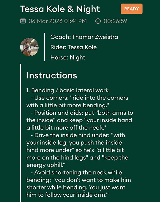 “It’s amazing how many details you can see from the training,” said Tessa Kole. “With the Coach-Copilot app I can review my training afterwards and continue practising the exercises at home by myself. It really works for me because I can review my training better and train more effectively. Thamar can also review the session, so we both clearly see what we did in the lesson and how the horse moved. In the end, I think that helps us progress better.”