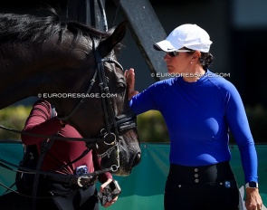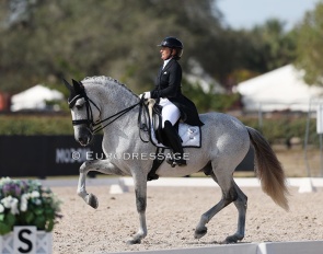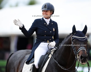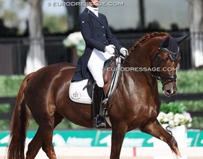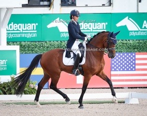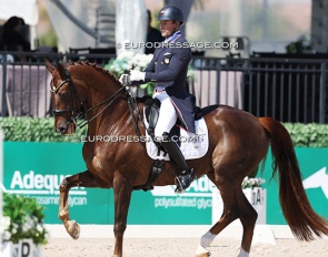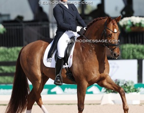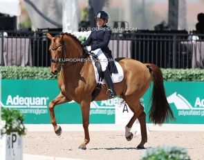 Benjamin Werndl on Embolo (by Escamillo x Detroit). An owners' group bought him for 750,000 euro. The horse has big gaits in the trot and canter extensions but the walk is problematic. The collected still scored 6.5, the extended 7.5 - 8