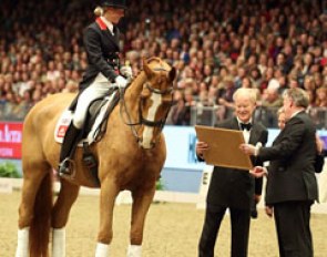 Trainer Sjef Janssen and co-owner Paul Schockemohle are watching Matthias Rath warm up Totilas