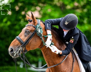 American Jennifer Hoffmann on Nasrin Mani's Hanoverian Endeavor (by Morricone x Foundation). Talented horse with good gaits but the hand aids could have been more subtle for a higher submission score