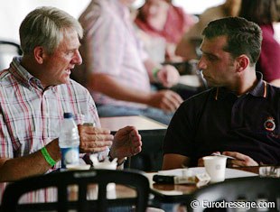 Spanish Team trainer Jan Bemelmans talking seriously to Enrique Cruces Fernandez, who is preparing his horse RMS Keops at Bemelmans' stable in Germany for the CDIO Aachen (and WEG).