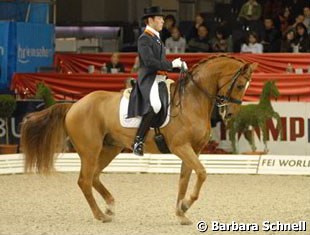 ...They probably would have decided differently on the second day, when Theodorescu had difficulties to get the chestnut going and did not only use the whip generously in the warm-up arena but also couldn't keep the horse from simply stopping a couple of times during the freestyle. He certainly has the nerve for a boiling arena like Frankfurt, but does he have the spark for Hongkong?