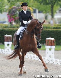 Boree a put in a secure ride in which the lovely silhouette of her chestnut gelding appealed to the eye. The trot work was correct and fluent, though Doppelspiel could have more ground cover in this gait. The rein back was lovely, the left halt pirouette tiny and the extended walk scored 6s and 7s. In canter the pony scored highly in the extensions, but he lost the collection especially in the counter canter right. The final extended canter was very uphill. Boree totalled 65.842% with French judge Prain definitely offering a helping hand towards the victory with her 68.684% score.