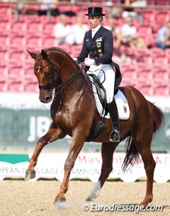 The Individual test was ridden late Saturday afternoon but the thermometer still indicated 36° C at the time. Dutch Lisanne Zoutendijk rode her 9-year old German Riding pony gelding Champ of Class round 6 PM and her pony seemed a bit affected by the heat. Maybe the judges were too as they gave a few weird high scores for a few not so nicely executed movements despite Zoutendijk's overall very strong ride. The halt at entry was rolling, with the pony putting himself into a square but stretched halt. That movement still produced an average score of 7.7 on the board. Would a Polish or Hungarian rider get the same mark for the executing that movement the same way, one wonders? The trot work was fluent and confident, but there could have been a bit more bending in the half pass right. The rein back was mediocre with the pony getting crooked and hitting the fence (score 7.7). There were two mistakes in the rhythm in the extended trot on the long diagonal (7). The collected and extended walk were very well ridden. In the canter the pony appeared a bit tired but remained concentrated on his rider. There was a loss of balance in the voltes on the centerline but the extended canters were oustanding. The contact with the bit and Champ of Class' chewing has improved tremendously compared to a year ago. Zoutendijk received 77.317% from the judges, which put her in bronze medal position. Her low score was 75.610% (Ebert), her high sore was 78.415% (Baarup).