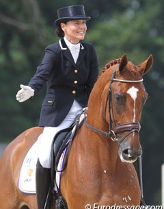 A tendon injury has now ended the horse's sport career. According to the FEI database Larmoyeur owns Aston Martin NL in partnership with stallion owner Gert Willem van Norel and her former husband Sjak Laarakkers, from whom she divorced in 2012.