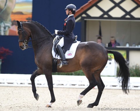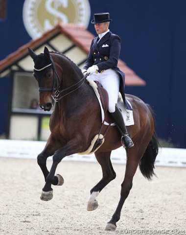 His 74.457% score on the Swiss bred and owned 10-year old Well Done de la Roche (by Furstentraum x Walt Disney) proves that. The bay mare is a super talented, elegant horse with incredible piaffe-passage potential, but she was so incredibly tense and tight as a bow. Not a single diagonal showed proper extensions, not in trot, not in walk and not in canter (since the Totilas days the judges' mathematical formula is "Flashy horse/famous rider + mediocre/poor trot = 7" - best examples are Totilas and Bella Rose).