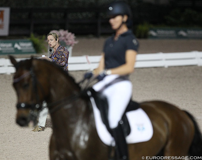 Benjamin Albright's 11-year-old Westfaliann gelding Falstaff (by Furst Piccolo x Fruhlingsball) had the tendency to stop both in the trot and in the canter. At that moment, Werth reminded the rider that his seat was the key point to control the overtrack of the stride.
