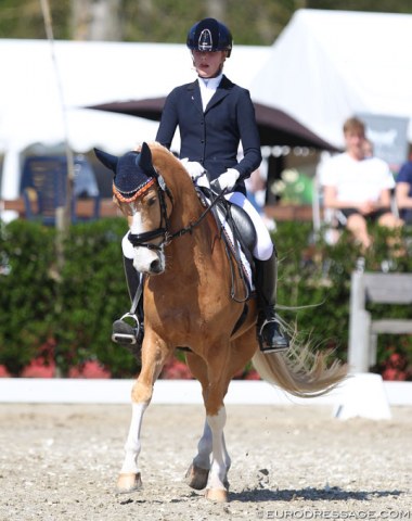The pony tour kicked off with the team championship test which was won by debutant Nathalie Thomassen. The 14-year old competed at her very first international show in her budding career and immediately captured a first place on her wonderful 10-year old Danish bred Lykkehoejs Dream of Dornik. Sired by the former Danish team pony stallion Melli's Dornik out of a Cupkeshof Winobert, Dream of Dornik is quite a tall pony brimming with talent and potential. This one-to-watch scored a winning 73.095% in the team test. The pair went on to place second in the individual test (71.757%) and in the freestyle (74.042%).