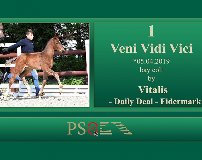 The 2019 PS Online Foal auction opens with catalog nr 1 "Veni Vidi Veci" (by Vitalis x Daily Deal x Fidermark). This stunning bay colt is a world class mover and has a top pedigree to boot. He descends from one of the most hereditary Westfalian mare lines (Addi line), which produced PSI auction highlight and Bundeschampion Revenant. From this line come licensed stallions Prinz Segelhorst, Frühlingstraum I and II, Baron de Ley W, Bertoli W,, Ehrendorff, Estobar/Hubertus Schmidt, Eichendorff/Victoria Max-Theuer/AUT, Moliere/Victoria Max-Theuer/AUT, Frühlingssturm, as well as numerous premium mares, successful sport horses such as Isabell Werth's double German Champion Amaretto.