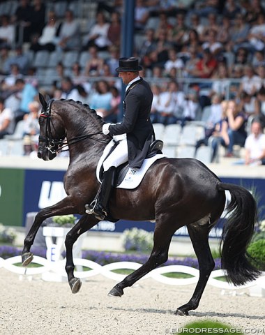 Matthias Bouten and Toni and Marina Meggle's 9-year old Trakehner stallion Grimani (by Gribaldi x Monteverdi) slotted in fourth. The black is a very refined, graceful mover with his long legs and handsome looks. He could be a bit more through the body and swings the hindquarters to the right in the tempi changes, but there is a lot of promise in that tank. They received 70.382%.