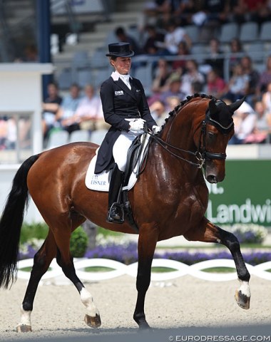 Hubertus Schmidt has a serious iron in the fire in American Nancy Gooding's 7-year old Oldenburg stallion Denoix (by Destano x Pik Noir). The pair already impressed three months ago at the CDI Hagen where this very young and green liver chestnut was thrown into the deep end and competed in the international small tour division instead of the national developing PSG horse class. The supple and strong mover impressed in Hagen as well as in Aachen, although he is still not secure in his self carriage, which showed in his swinging hindquarters in the changes and him running out of steam at the end of the test. They posted 70.588% for third place.