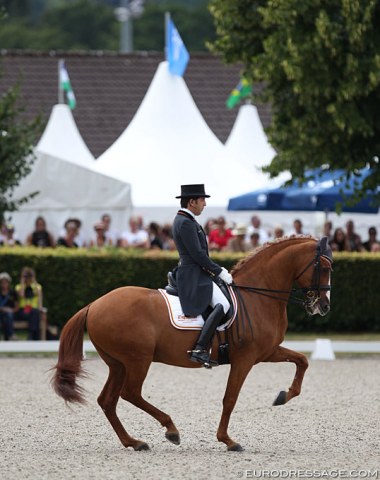 Cathrine Dufour and the Zinglersen family's Westfalian gelding Bohemian (by Bordeaux x Samarant) completed the top five with a 78.809% earning test. The liver chestnut is just 9 years old and he is still very green at Grand Prix, which shows in him still being behind the vertical and not yet fully carrying himself from behind. However he already shows many flashes of greatness, including the very regular and floaty passage. The extended trots, though, are rushed and over bent to the left. The first piaffe was small, but Dufour rode the piaffe-passage serpentine with much feeling. The extended canter and two tempi changes need to have more uphill tendency but the ones were straight. The pirouettes were small but still a bit flat. The final piaffe at X was wide in front (which is a proof that he does not have that self carriage yet), but overall it was a very appealing test with so much more in the tank for the future.