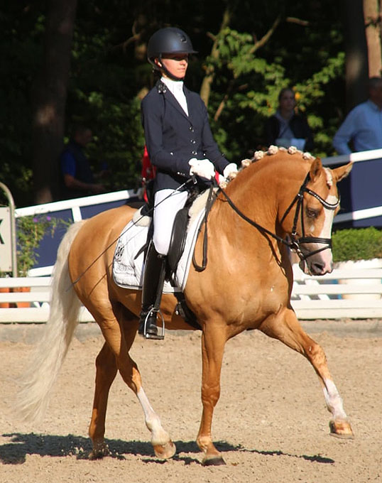 This palomino licensing champion and Bundeschampion competed at three European Pony Championships with three different riders. The owner's daughter, Nadine Krause, represented Germany at the 2015 European Pony Championships where they won double individual silver. in 2016 Inga Katharina Schuster took him to the European Pony Championships in Vilhelmsborg and got silver in the individual test, but retired in the Kur. Jana Lang began riding him in 2017 and represented Germany at the 2017 and 2018 European Pony Championships, winning team gold and two times individual test bronze.