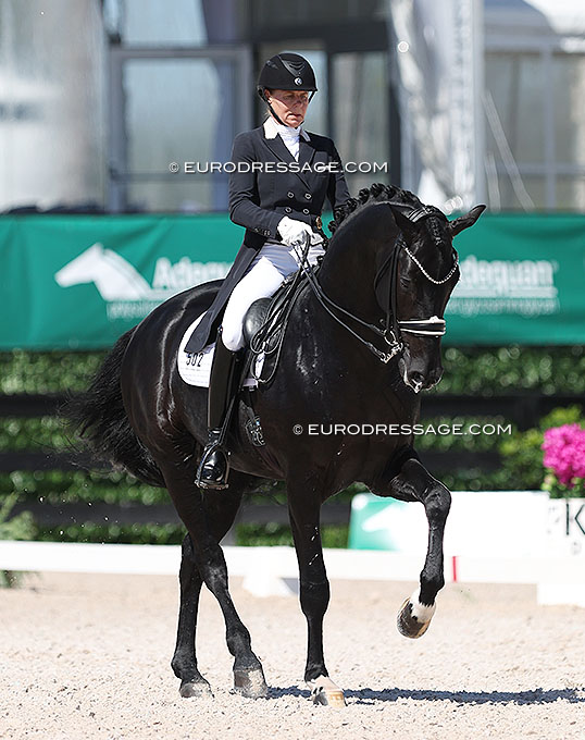 Although she has a ton of experience in her bag, Canadian team rider Jill Irving left the arena admitting how nervous she was piloting the 14-year old Hanoverian Delacroix (by Dancier x Don Crusador). The bay gelding was bought in the winter of 2021-2022 as Jill's 2022 World Championship hopeful, but that plan did not come to fruition and the pair only made its international show debut in April 2023. Today's Grand Prix start was their first international in six months time. The horse is very high quality and thoroughly schooled at Grand Prix level, but today he trailed with the left hind in the passage and there were several bobbles (in the second trot extension and two tempi changes) that affected the score. The very sympathetic Irving placed fourth with 67.587%.