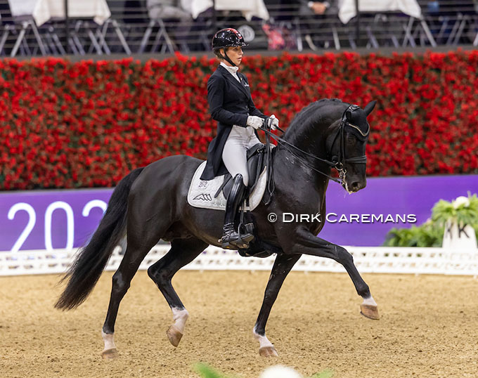 America's highest scoring pair of the moment, Adrienne Lyle and the 13-year old KWPN gelding Helix (by Apache x Jazz) were almost 10% off from the Kur scores she got in qualifiers in the USA. Lyle rode her second World Cup final in her career, her first was in 2019 on Salvino. With Helix she rode to tunes of Freedom (George Michael), Stand By Me (Ben E King) and Sweet Child of Mine (Guns 'n Roses). They entered the ring in a very tight frame, but the first piaffe was very nice but in the second he tensed up. In the first trot extension she pulled the head against the chest to hold him. He broke into canter. There was no overtrack nor relaxation in the extended walk. The rider tried to give him a few inches of rein now and then, but the horse remained on edge and the entire two tempi line was broken. The pirouettes would have been nice if the frame was not so short. The horse improved towards the end of the test though. They placed 16th with 71.255%, a score which generated whistling from the crowd while there was applause when the much lower spectator judging score of 65,108% appeared on the board.