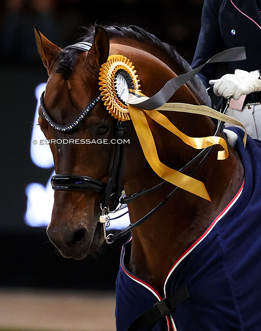 Raphael Netz presented the 13-year old Thuringian bred Dieudonne (by Dante Weltino x Sir Donnerhall) in a beautiful way with straight two tempi changes. In the one's he needs to cover more ground instead of cha-cha-chaing through them and in the piaffes the horse leaned on the shoulders, but there is plenty of potential for the future. They were fifth with 72.826%.