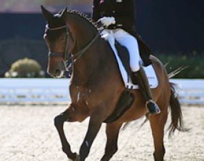 Helen Langehanenberg on Damsey. The Hanoverian stallion kicked to the spur in the first piaffe and then they lost their groove in the following piaffe-passage section