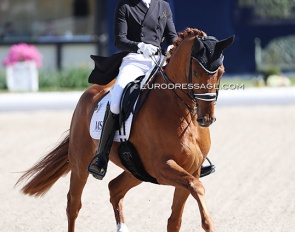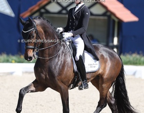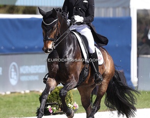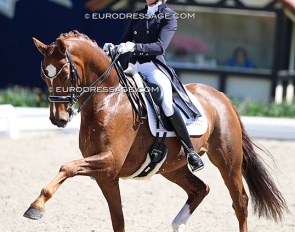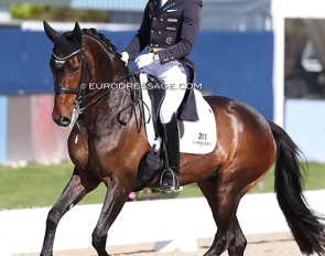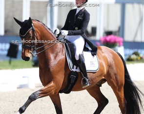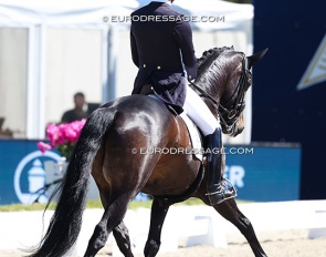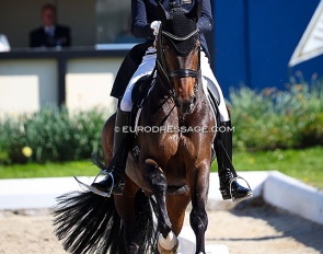 Benjamin Werndl on Embolo (by Escamillo x Detroit). An owners' group bought him for 750,000 euro. The horse has big gaits in the trot and canter extensions but the walk is problematic. The collected still scored 6.5, the extended 7.5 - 8