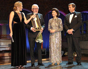 HM Queen Silvia (centre), Eric Lette, recipient of the lifetime achievement award, and Swedish Equestrian Federation President Anders Mellberg during the gala evening held in celebration of the centenary of the Swedish Equestrian Federation.