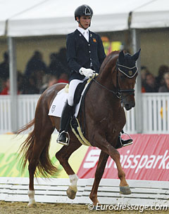 Juan Matute Guimon, a U.S. based Spanish junior rider and at age 16 the youngest Verden participant ever, rode Jamaicano de Ymas III. The horse was not entirely through in the bridle and lost balance. The walk was very nice