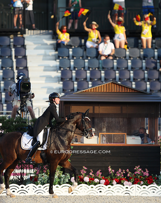 Belgians cheering at the end of Laurence Roos' ride on Fil Rouge (by Stedinger x Argentinus)
