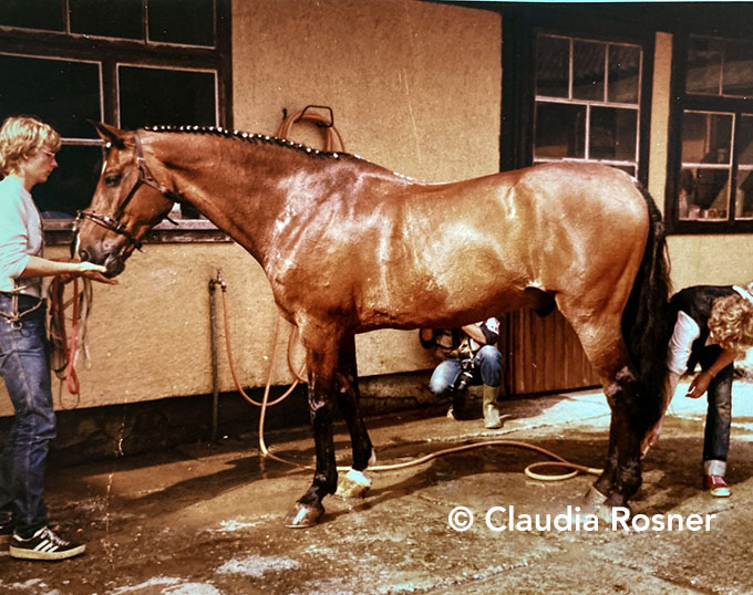 17-year-old Granat getting groomed before his very last competition. The Holsteiner gelding competed at Grand Prix level from 1972 to 1982 and won 15 team and individual medals.