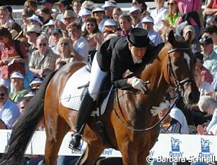 Susann Konrad is overjoyed as she hears the winning score for Moses in the 4-year old mares and geldings class