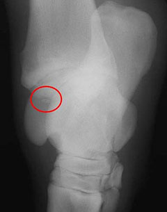 This is an example of how an OCD fragment typically looks on a radiograph. The OCD fragment seems to “float” within a defect in the main bone