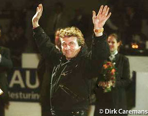 Sjef Janssen raises his hands in victory. In 2000 he was proclaimed Trainer of the Year by the International Dressage Trainers Club :: Photo © Dirk Caremans