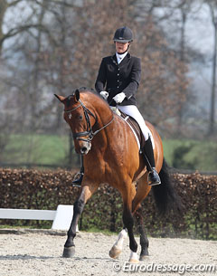 Emma van den Hooven on Beaumonde (by United x Fruhling). The bay was well presented and showed an active hindleg in trot. The walk had much understep but was limited in shoulder freedom. The flying changes were a bit plain