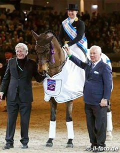 Isabell Werth and Don Johnson win the 2017 CDI-W Neumunster. Werth is flanked by show hosts Paul Schockemöhle and Ullrich Kasselmann :: Photo © LL-foto