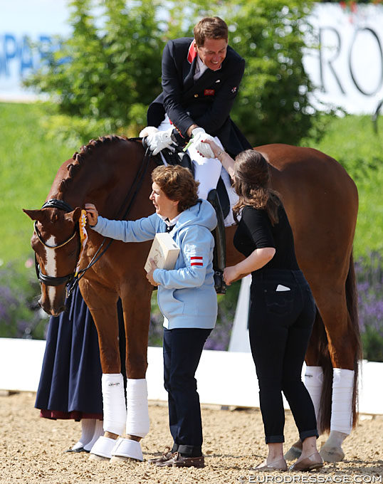 Year 2018 Event CDI Fritzens Horse Dono di Maggio Person Emile Faurie, Evelyn Haim-Swarovski, Marie Haim Description Show host Evelyn Haim-Swarovski pats Dono di Maggio as daughter Marie Haim congratulates Emile Faurie Photographer Astrid Appels Code 18_fritzens_faurie_dono_1282